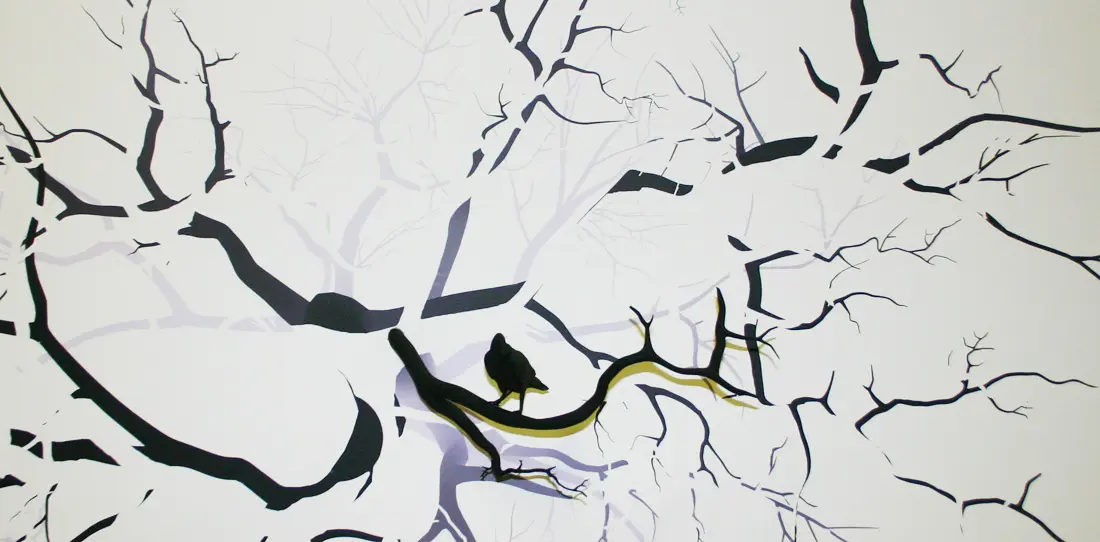 The Matrix-Tapestry "If" continues the history of Aubusson’s verdure with a vibrating, moving piece where a physical space, fixed like a heritage pedestal (the tapestry), plays with immateriality and a renewed movement, reconfigured in a contemporary synthesis. Pascal Haudressy was inspired by Caspar David Friedrich’s painting The Tree of Crows, introducing a contemplative and meditative dimension into his installation. He emphasizes the motif of the crow as a link between the physical world and the spiritual realm. The tapestry, far from being a mere screen, exists in subtle emulsion with the projected image and the three-dimensional sculpture, creating a matrix-generating artwork made of heritage materials, light, and movement.