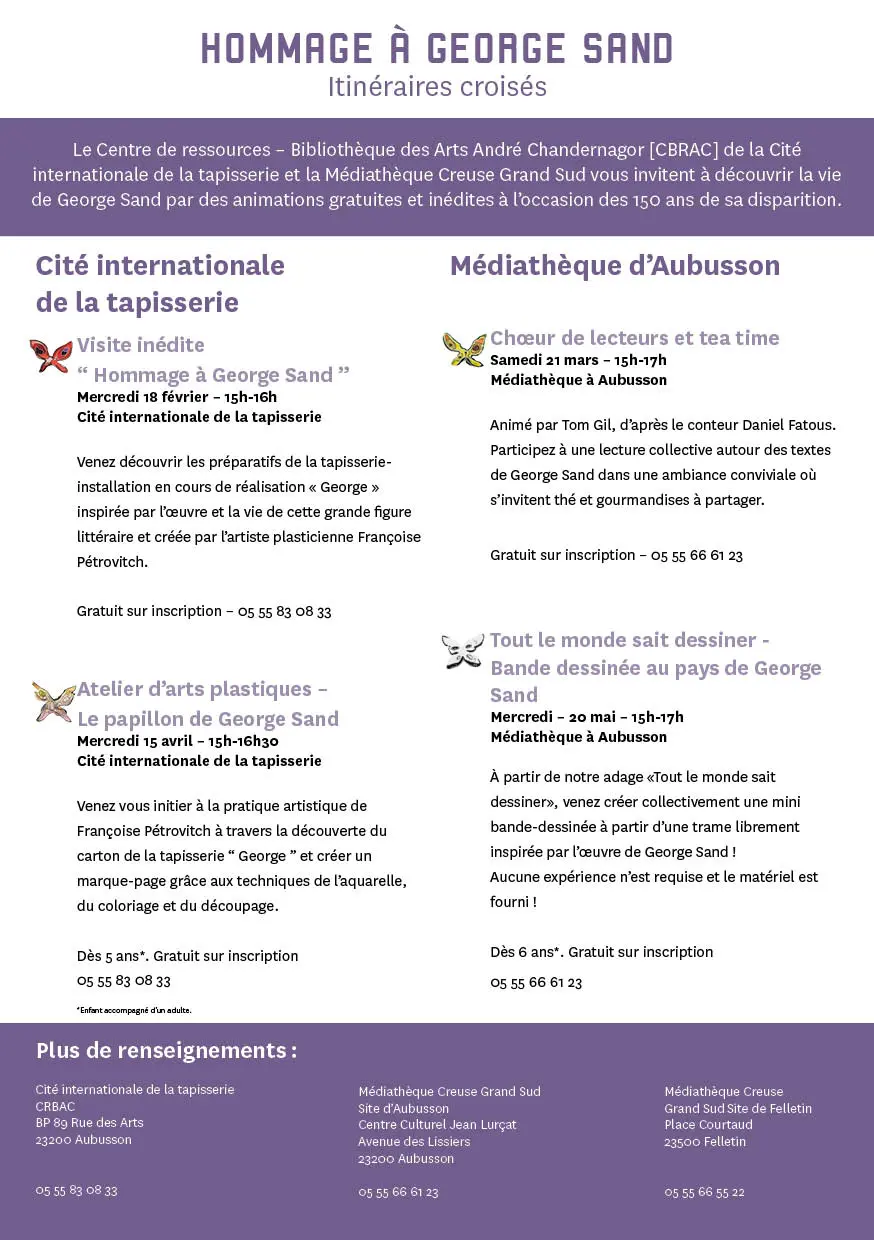 Le Centre de ressources – Bibliothèque des Arts André Chandernagor [CBRAC] de la Cité internationale de la tapisserie et la Médiathèque Creuse Grand Sud vous invitent à découvrir la vie de George Sand à travers des animations gratuites et inédites à l’occasion des 150 ans de sa disparition.