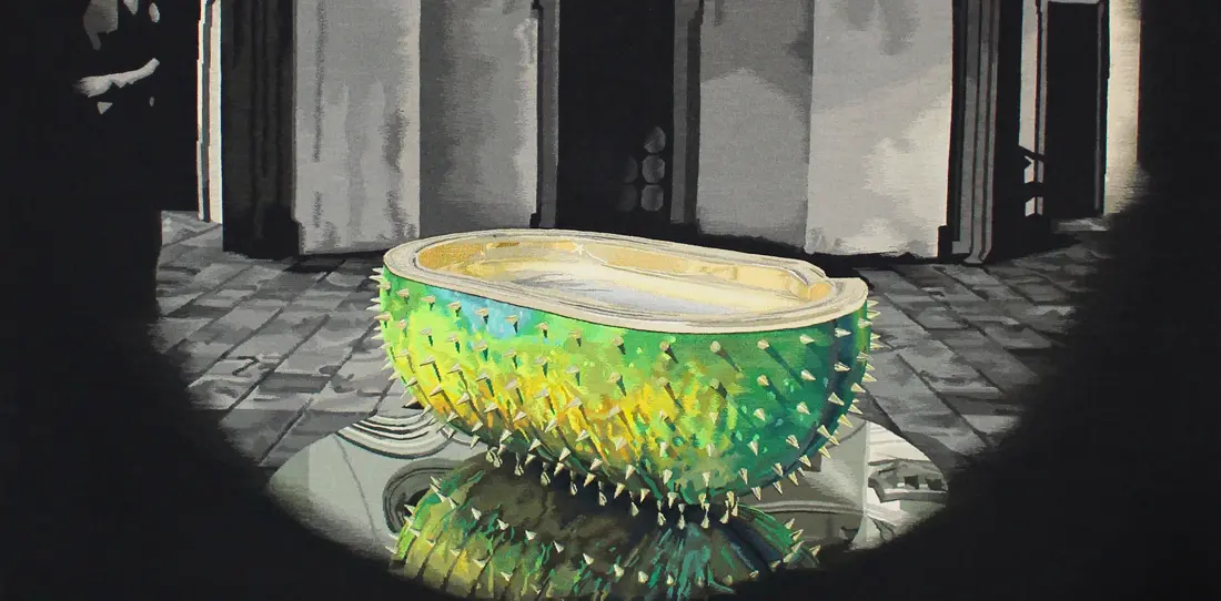 Le Bain est cocon de chrysalide, peau de fruit défendu, carapace d'animal sauvage, cactus inquiétant... La luminosité moirée, ondée de la tapisserie et ses nuances sont inspirées du coléoptère « Sagra Longicollis » vert (famille des Chrysomélidés), véritable bijou de la nature. La tapisserie épouse entièrement les courbes, elle est la matière soyeuse et la forme du bain tout à la fois, ses clous ou piquants racontent ce qu'elle protège : l'intimité et la nudité du corps, mais aussi l'élément précieux et vital dont elle se fait la gardienne, le réceptacle hérissé et réfléchi : l'eau.